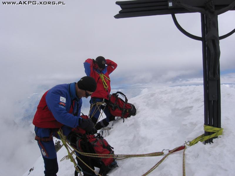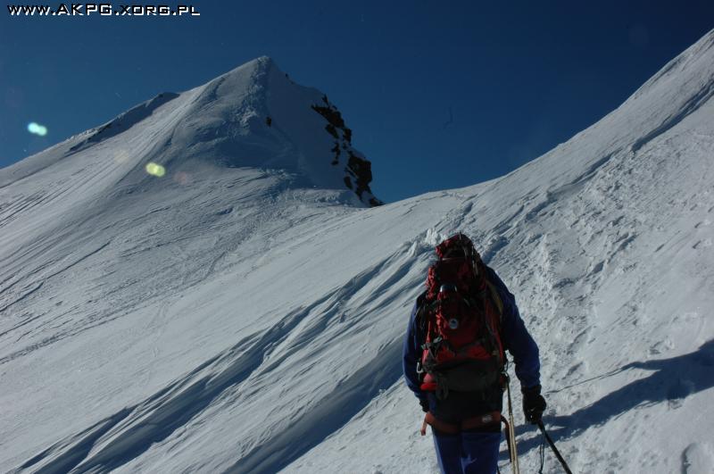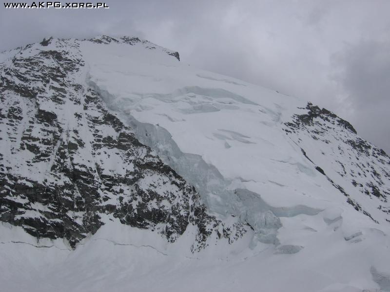 Na Taschorn już gorzej, wejście od tej doliny jest mało uczęszczane, nie było żadnych śladów tak więc torowaliśmy sobie drogę. Napotkaliśmy sporo trudności, kluczowy moment przy omijaniu seraka okazał sie nie do przejścia tak więc szukaliśmy innych możliwości. Skończyło się na wspinaczce na dziabach, mnóstwie śrub lodowych i trawersie ściany o 60-70 procentowym nachyleniu tak więc było ciekawie, nie wspomne już o zejściu gdzie była walka o życie w żywym lodzie. Całe przejście zajęło nam 16h, dostaliśmy po kościach mocniej niż na Matterhornie a miejscowi przewodnicy dopiero gdy zobaczyli ślady to nam uwierzyli, że zrobiliśmy taką drogę 😉 Jednym słowem był wypasik!!!